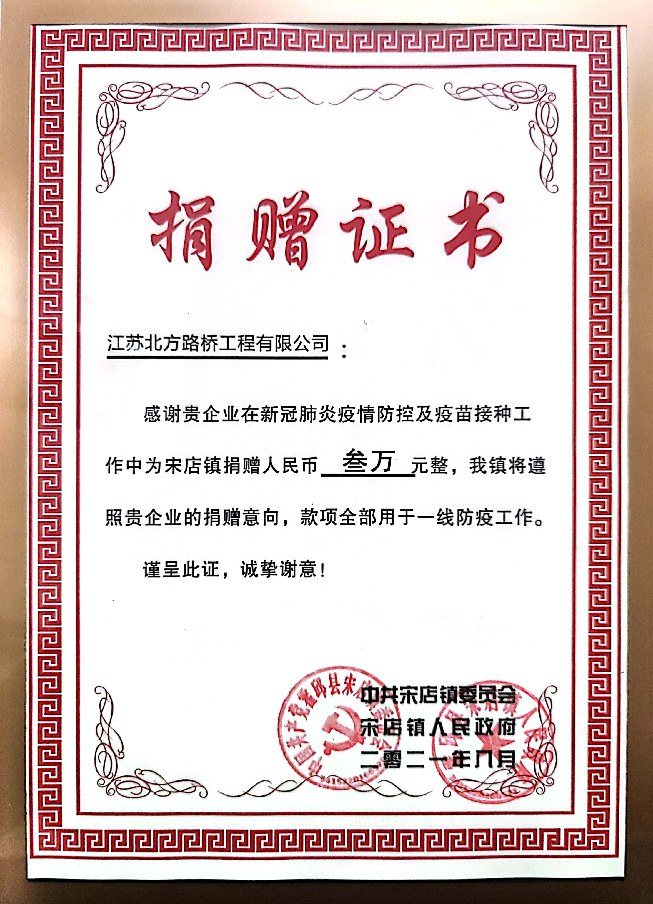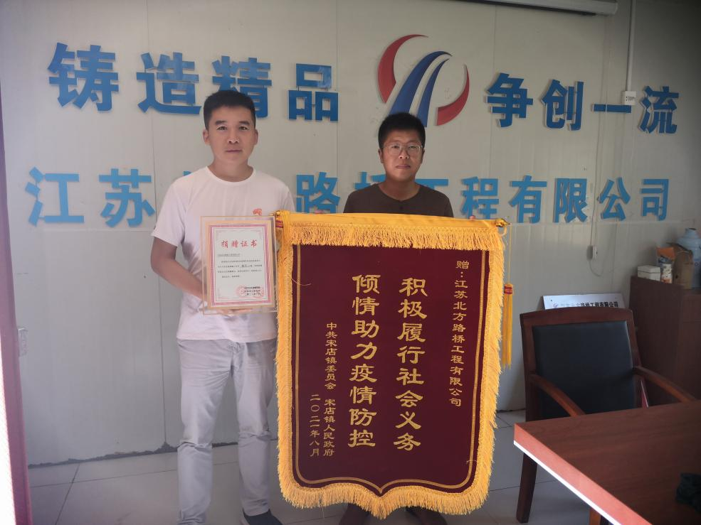 2021年9月11日上午,安徽霍邱县中共宋店镇委员会、宋店镇人民政府派工作人员把一面写有“积极履行社会义务,倾情助力疫情防控”的锦旗和捐赠证书,送到江苏北方路桥工程有限公司在合肥高新区霍邱县现代电子信息产业园道路建设施工现场负责人手中,以表彰江苏北方路桥工程有限公司在新冠肺炎疫情防控及疫苗接种工作中的贡献。