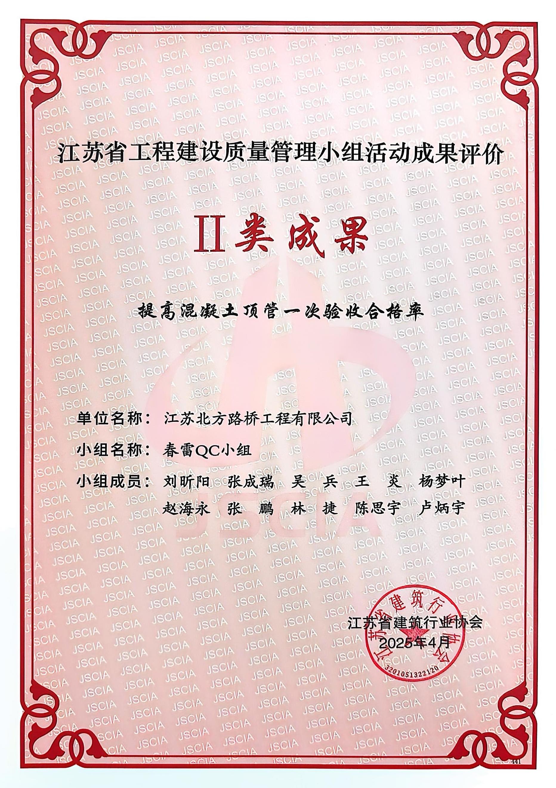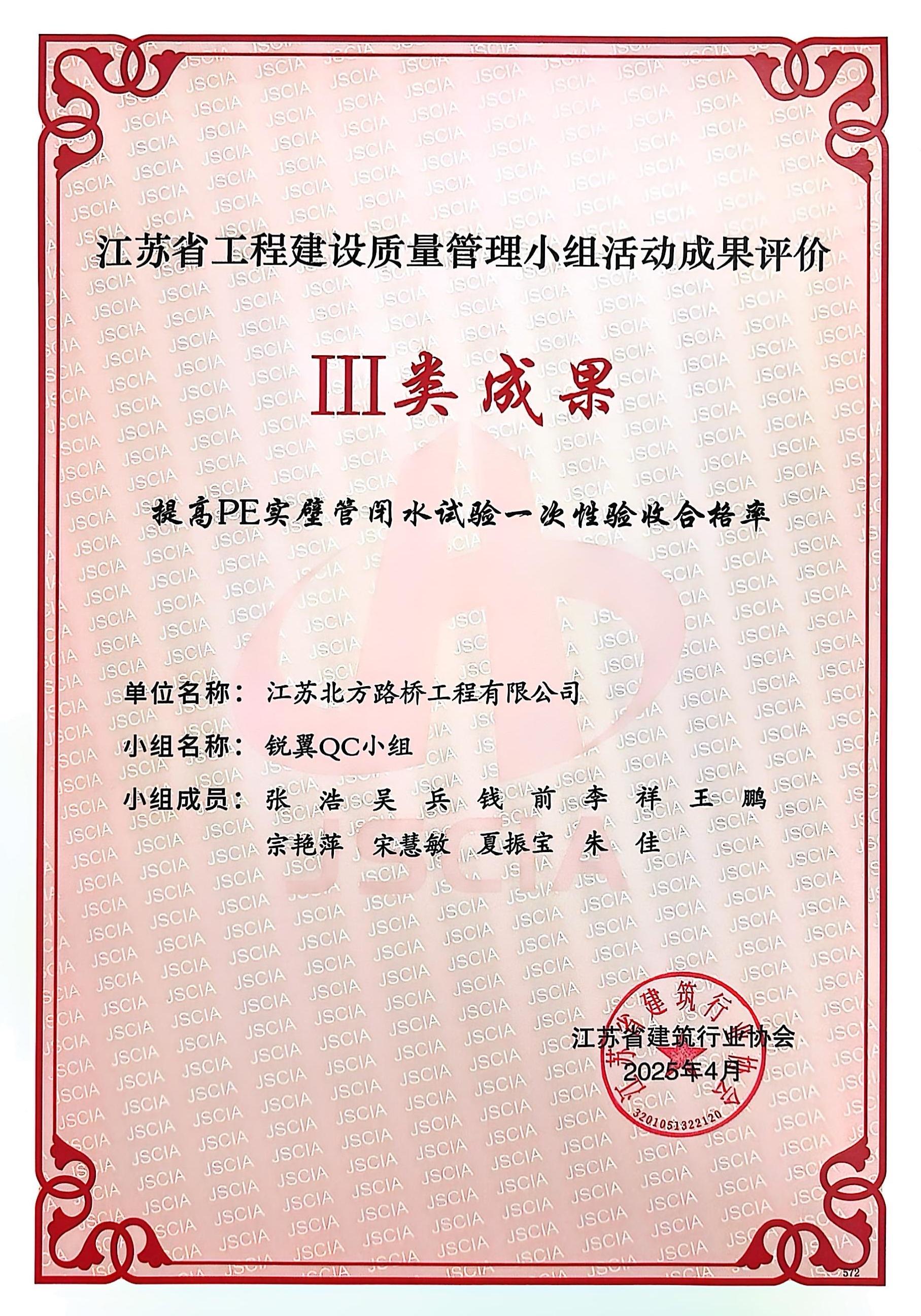 2025年6月23-25日,江苏省市政工程协会在盐城举办了2025年江苏省市政工程建设质量管理小组成果发布会。本次发布会旨在总结推广全省市政工程质量管理先进经验,提升行业质量管理水平,经过激烈角逐,北方路桥再获佳绩,“春雷”QC小组凭创新的课题研究,严谨的数据分析和卓有成效的实践成果脱颖而出,其研究成果《提高混凝土顶管一次验收合格率》荣获“一类成果”奖项。另外,在今年4月份,江苏省建筑行业协会在常州发布的质量管理小组活动成果评价发布会,我公司的“春雷”QC小组《提高混凝土顶管一次验收合格率》荣获“二类成果”奖,“锐翼”QC小组《提高PE实壁管闭水试验一次性验收合格率》荣获“三类成果”奖,这累累硕果,不仅展现了我公司在市政工程质量管理领域的创新实力和技术水准,同时也是建筑行业对北方路桥一直秉持的“质量为本、创新为魂”理念的充分肯定,今后,北方路桥将继续深化QC小组活动,为市政工程建设高质量发展贡献更大的力量。