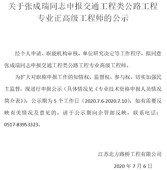 关于张成瑞同志申报交通工程类公路工程专业正高级工程师的公示
