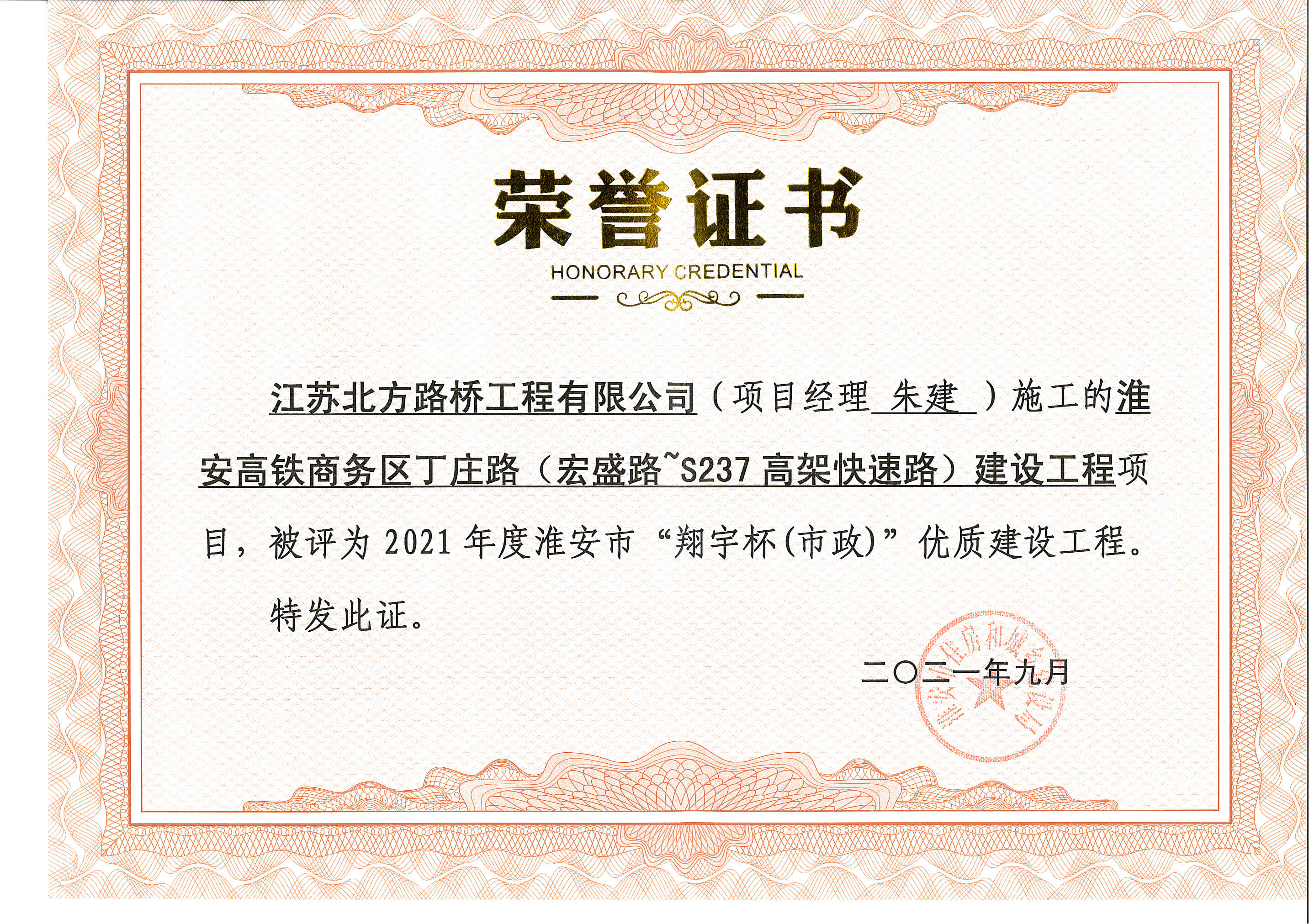 江苏北方路桥工程有限公司施工的淮安高铁商务区丁庄路(宏盛路--S237高架快速路)建设工程项目,项目经理:朱建。在2021年9月被淮安市住房和城乡建设局评为2021年度淮安市“翔宇杯(市政)”优质建设工程。