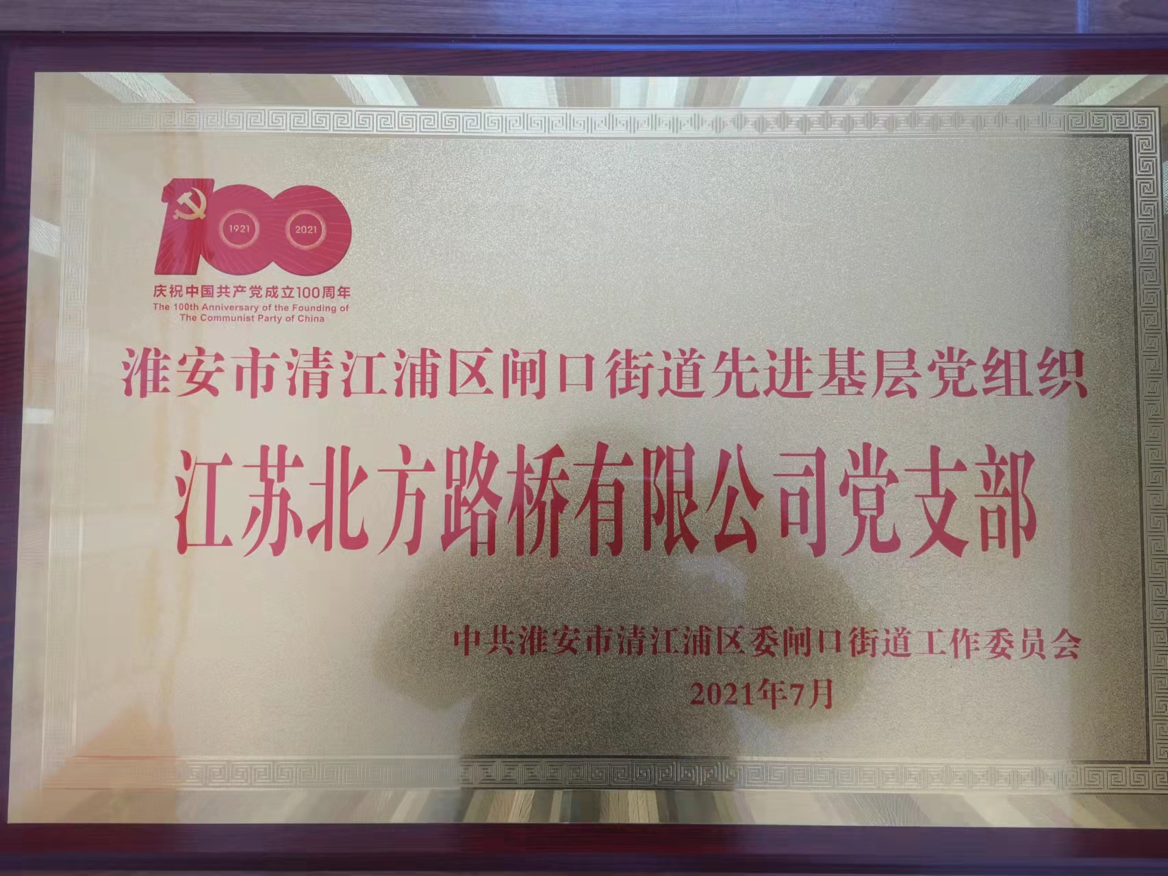 在中国共产党成立百年华诞之际,江苏北方路桥有限公司党支部被中共清江浦区委闸口街道工作委员会授予“淮安市清江浦区闸口街道先进基层党组织”光荣称号。