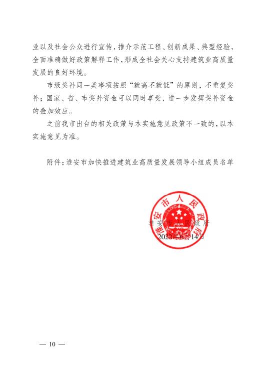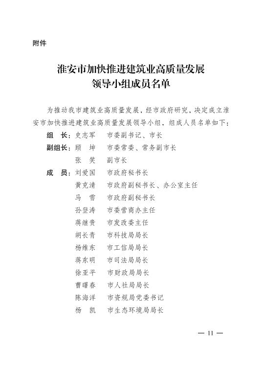 《实施意见》在三个方面对加快推进建筑业高质量发展提出了保障措施:一是强化组织领导,成立淮安市加快推进建筑业高质量发展领导小组,市政府主要领导任组长;二是完善推进机制,及时通报建筑业发展产业规划、年度计划完成情况,跟踪评估相关政策落实情况;三是广泛宣传引导,推介示范工程、创新成果、典型经验,形成全社会关心支持建筑业高质量发展的良好环境。