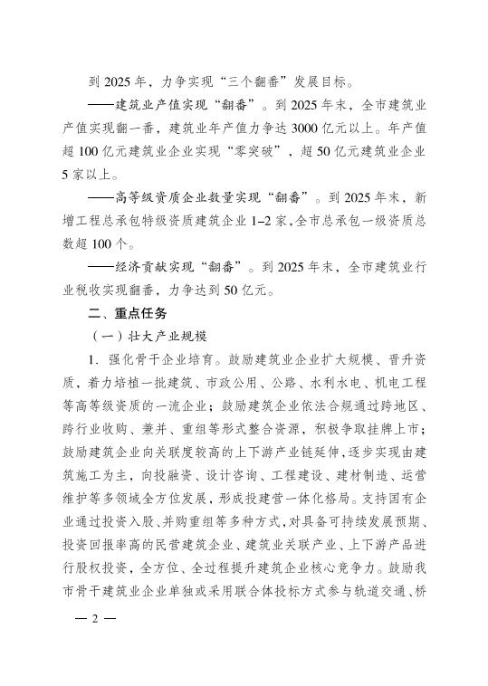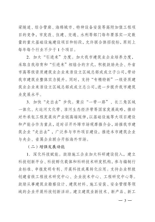 围绕建设长三角北部现代化中心城市目标,明确到2025年,力争实现“三个翻番”:一是全市建筑业产值实现翻一番,建筑业年产值力争达3000亿元以上;二是新增工程总承包特级资质建筑企业1-2家,全市总承包一级资质总数超100个;三是全市建筑业行业税收实现翻番,力争达到50亿元。