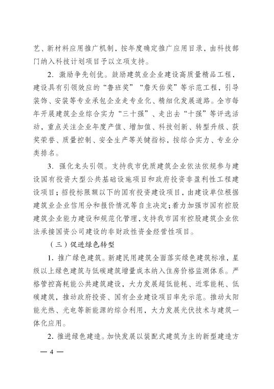 《实施意见》从三方面指出增强发展动能的重点工作内容:一是深化科技赋能,鼓励企业参与编制行业标准、申报发明专利、开展科技成果转化应用、创建工程技术研究中心等。二是激励争先创优,鼓励企业建设具有引领效应的“鲁班奖”“詹天佑奖”等示范工程,引导专业承包企业走专业化、精细化发展道路。三是强化龙头引领,支持我市优质建筑企业参与建设国有投资大型公共基础设施项目和政府投资非盈利性工程建设项目建设。