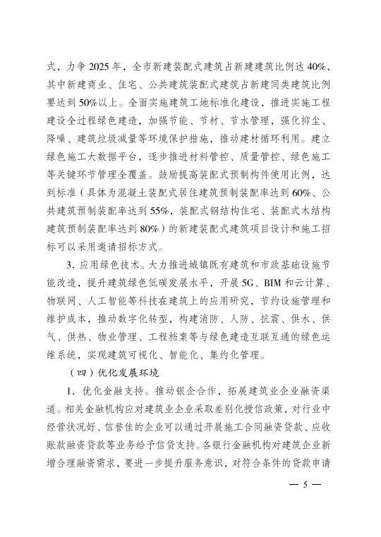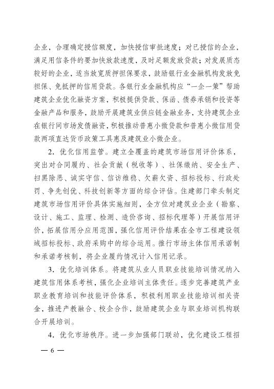 《实施意见》从四方面工作举措,推进建筑业高质量发展:一是优化金融支持,推动银企合作,采取差别化授信政策、“一企一策”等方式,积极推动两项直达货币政策工具惠及建筑业小微企业。二是优化信用监管,建立全覆盖的建筑市场信用评价体系,制定建筑市场信用评价具体实施细则,推行市场主体信用承诺制和承诺考核制。三是优化培训体系,将建筑从业人员职业技能培训情况纳入建筑信用体系考核,逐步完善建筑产业职业教育培训和技能评价体系。四是优化市场秩序,出台具体办法,严厉打击围标串标、恶意投诉、缠访闹访等现象。