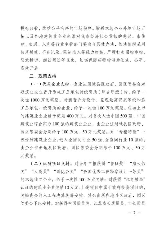对当年申报获得“鲁班奖”“詹天佑奖”“大禹奖”“国优金奖”“全国优秀工程勘察设计一等奖”的本地独立企业,给予一次性100万元奖励;对获得“江苏精品”认证的建筑业企业奖励10万元。