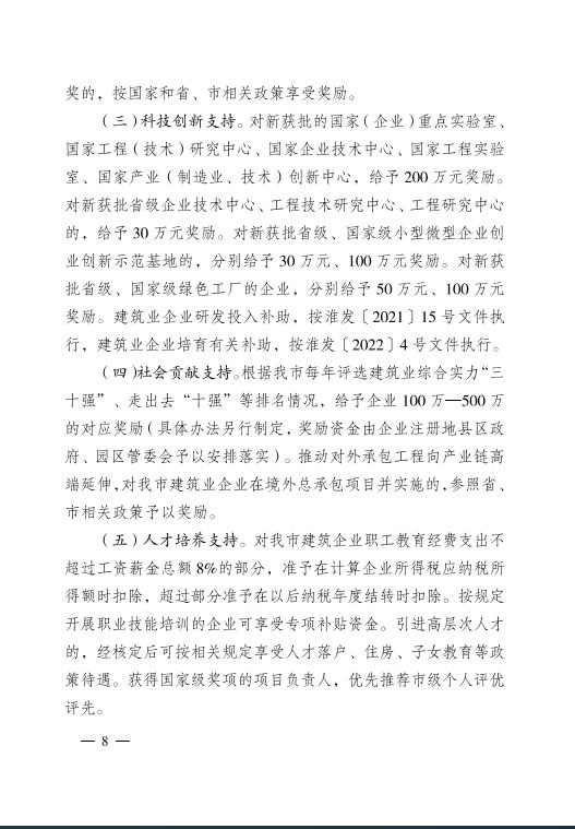 对我市建筑企业职工教育经费支出不超过工资薪金总额8%的部分,准予在计算企业所得税应纳税所得额时扣除,超过部分准予在以后纳税年度结转时扣除。按规定开展职业技能培训的企业可享受专项补贴资金。引进高层次人才的,经核定后可按相关规定享受人才落户、住房、子女教育等政策待遇。获得国家级奖项的项目负责人,优先推荐市级个人评优评先。