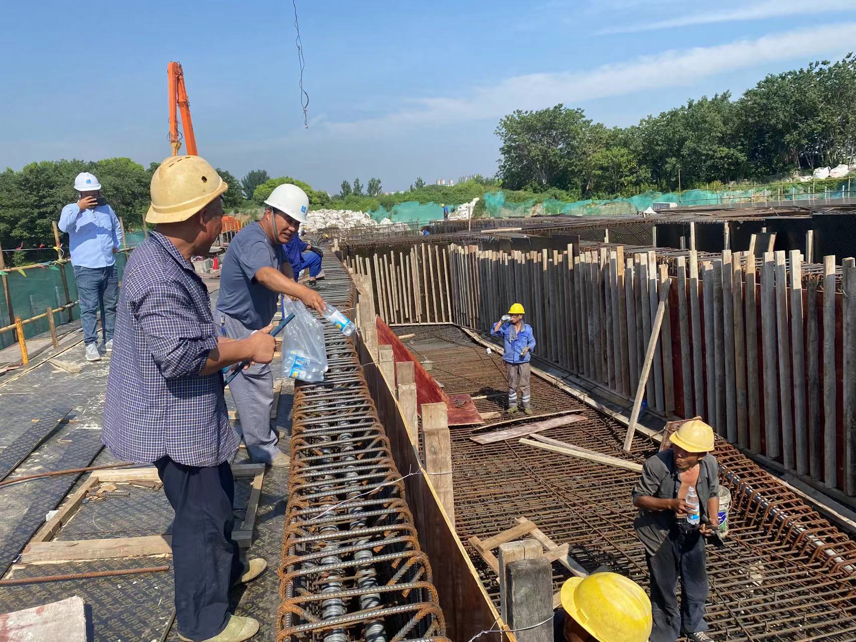 7月16日,江阴持续高温,花北路桥施工现场,北方路桥副总徐波同志发放防暑降温饮品,为坚守和战斗在生产一线的北方路桥人送去夏日关怀。