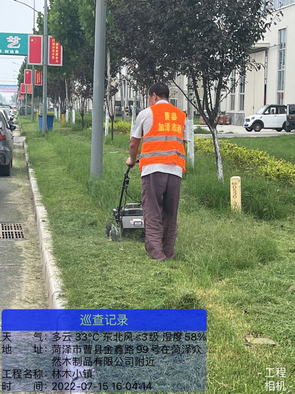 7月12日,荷泽市曹县林木小镇项目草坪修剪作业现场。