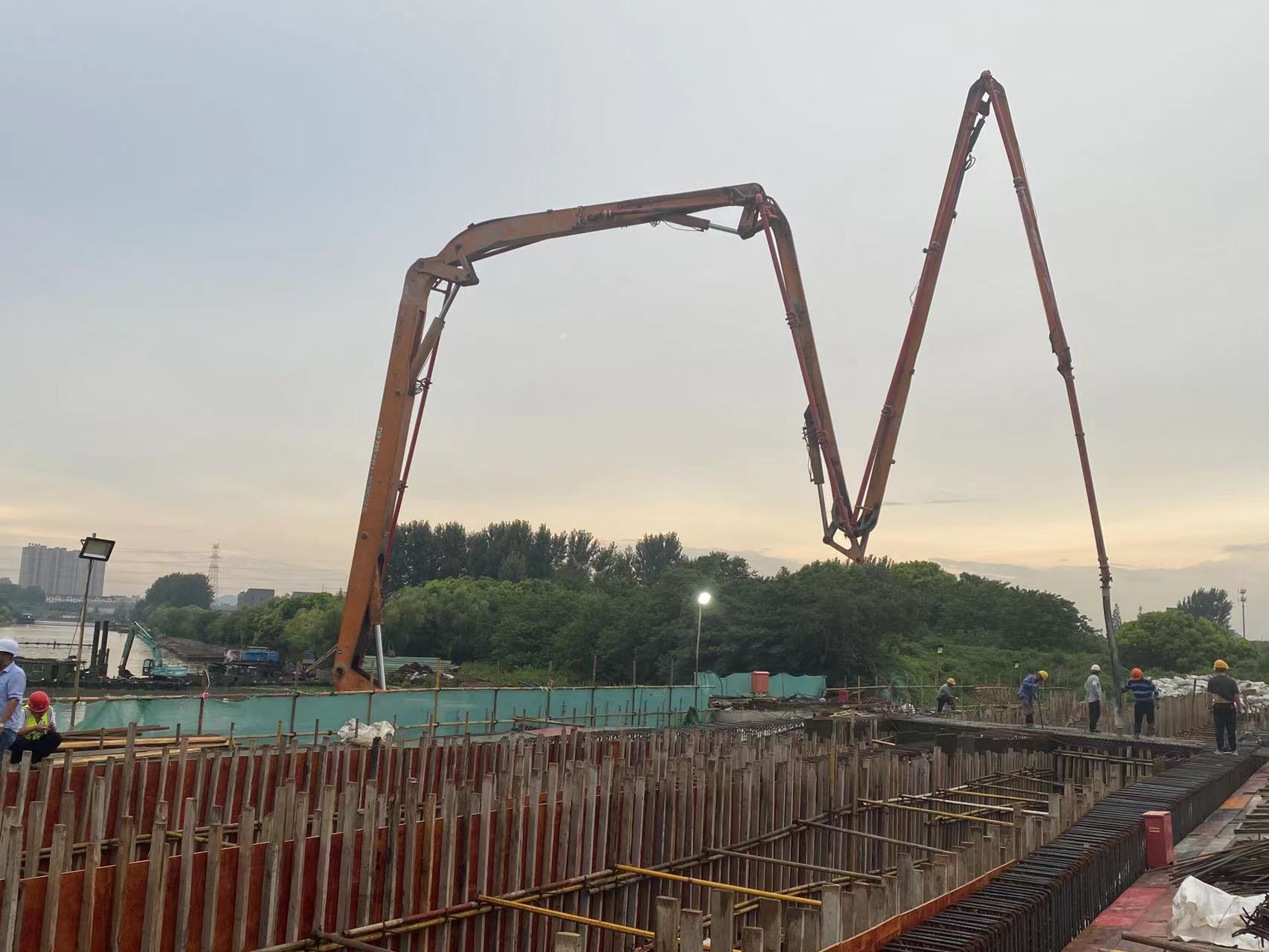 7月26日,江阴花北路桥箱梁底腹板砼浇筑作业现场。