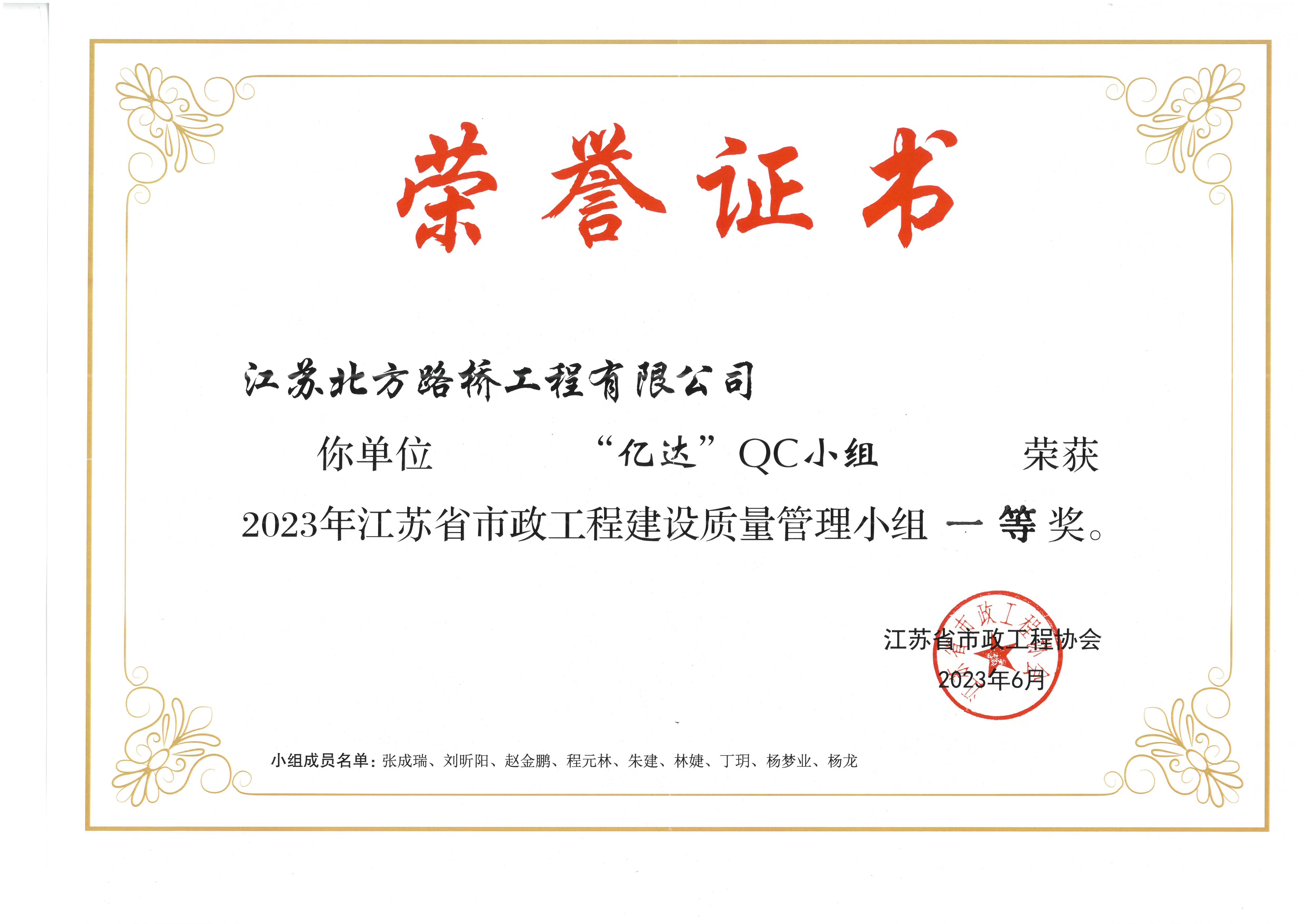 亿达QC小组荣获2023年江苏省市政工程建设质量管理小组一等奖