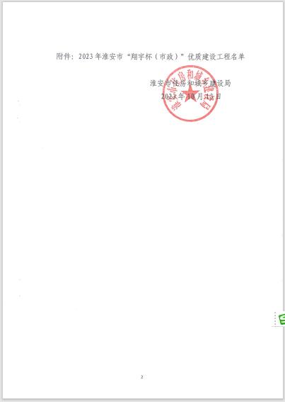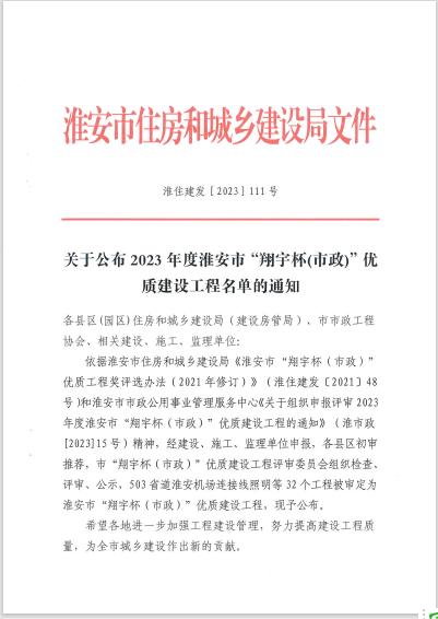 为更好地鼓励建设各方争创优质精品工程,全面提升建设工程质量水平,依据规定和要求,经各单位申报,各县区初审推荐,评审委员会组织检查、评审和官网公示,淮安市住房和城乡建设局于近日公布了2023 年淮安市“翔宇杯 (市政)”优质建设工程名单,32个工程入选淮安市优质建设工程名单,我公司承建的承德路综合提升工程(1415 街区--解放东路)项目、经开区交通干线两侧环境综合提升工程、淮阴区马头镇农高新城花漾年华小区一期及一期扩建配套工程等三个项目获此殊荣。
