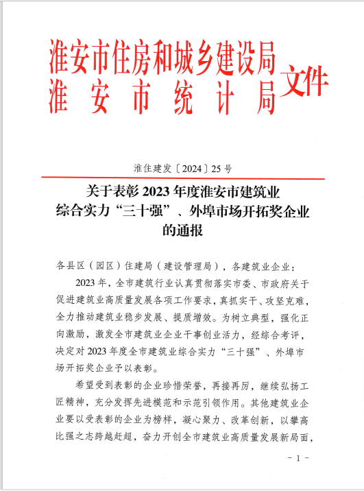 近日,从淮安市住房和城乡建设局传来喜讯,经综合考评, 北方路桥再次蝉联2023年度淮安市建筑业外埠市场开拓奖十强企业称号。