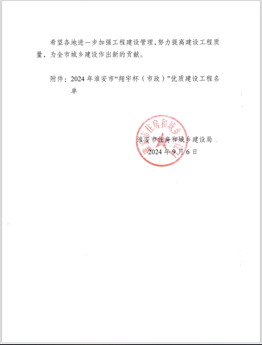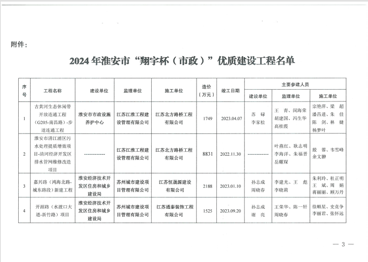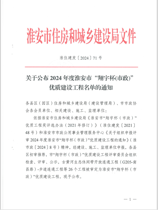 近日,经建设、施工、监理单位申报,各县区初审推荐,市住房和城乡建设局公布了2024年度淮安市“翔宇杯市政”优质建设工程名单我公司的古黄河生态休闲带开放连通工程(G205-南昌路)--步道连通工程和清江浦区污水处理提质增效项目--清河经济开发区排水管网维修改造项目榜上有名。面对形势新发展,北方路桥将更加珍惜荣誉,再接再厉,为家乡的经济高质量发展做更大贡献。