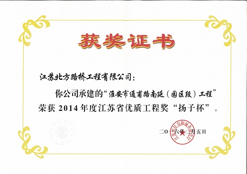 淮安市西安路南延、通甫路南延(园区段)工程三标段2011年10月25日开工,于2012年9月17日竣工,质量标准一次性验收合格,并荣获2014年度江苏省优质工程奖“扬子杯”!!!