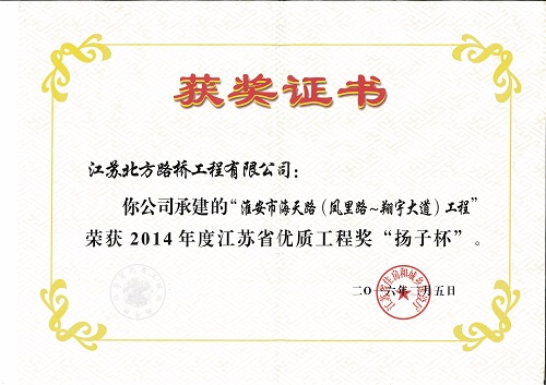 淮安市海天路(凤里路—翔宇大道)工程2011年6月13日开工,于2013年7月30日竣工,质量标准一次性验收合格,并荣获2014年度江苏省优质工程奖“扬子杯”!!!