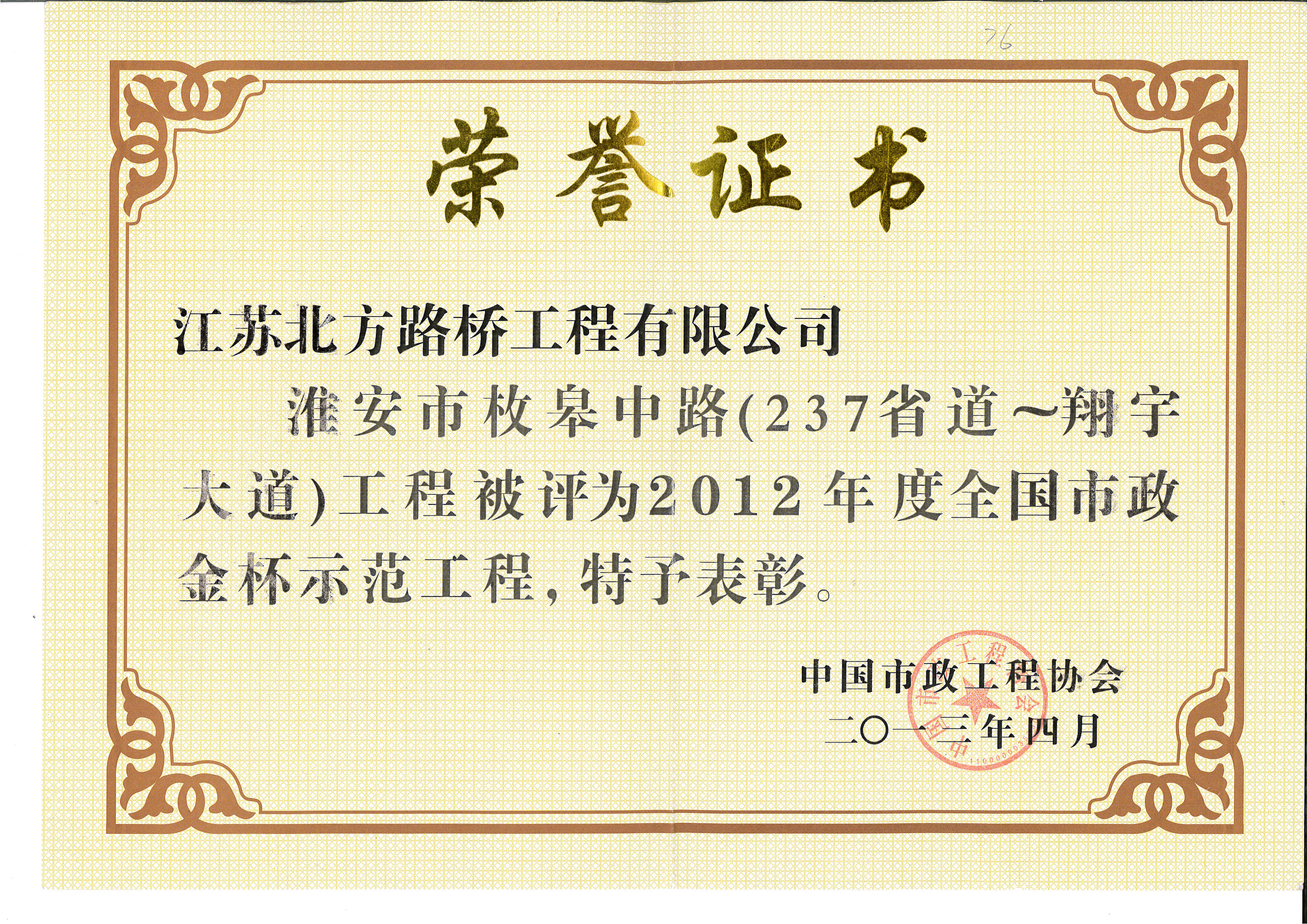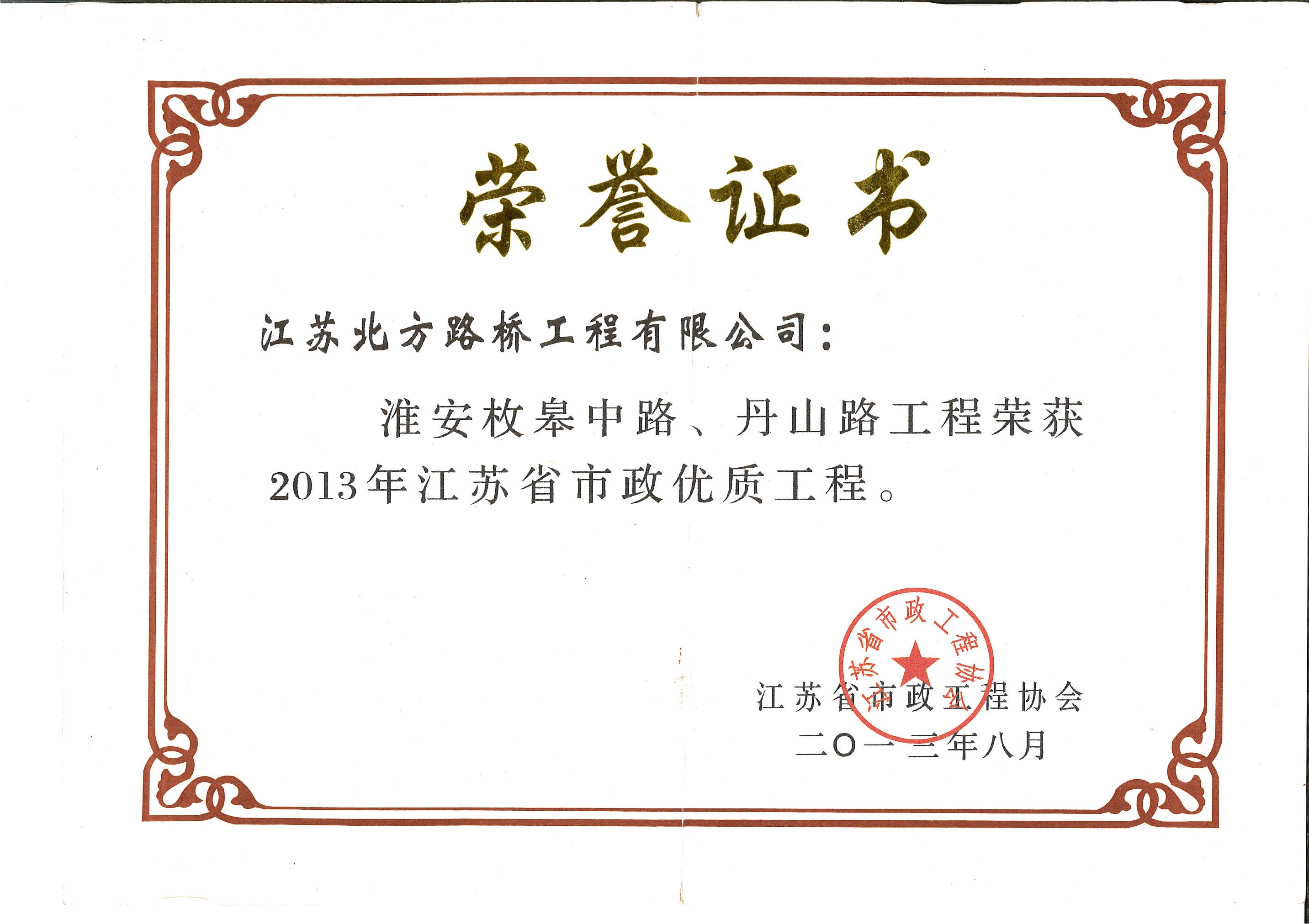 淮安新城丹山路、浦翠路、枚皋中路、山阳弯路、天和路工程2011年2月22日开工,于2011年9月1日竣工,质量标准为市优。其中枚皋中路工程杯评为2012年度全国市政金杯示范工程;枚皋中路、丹山路荣获2013年江苏省市政优质工程!!!