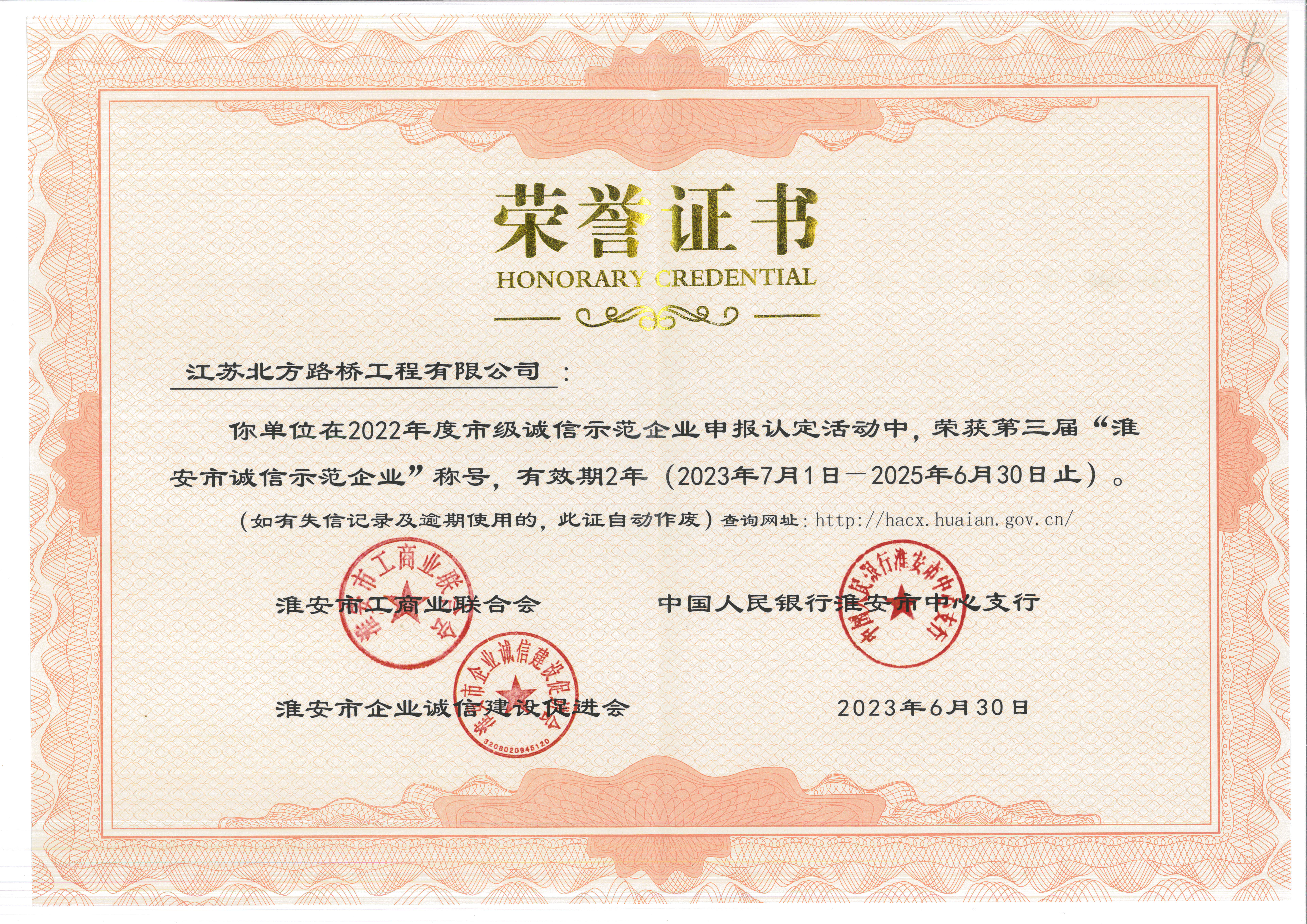 2022年度淮安市诚信示范企业荣誉证书